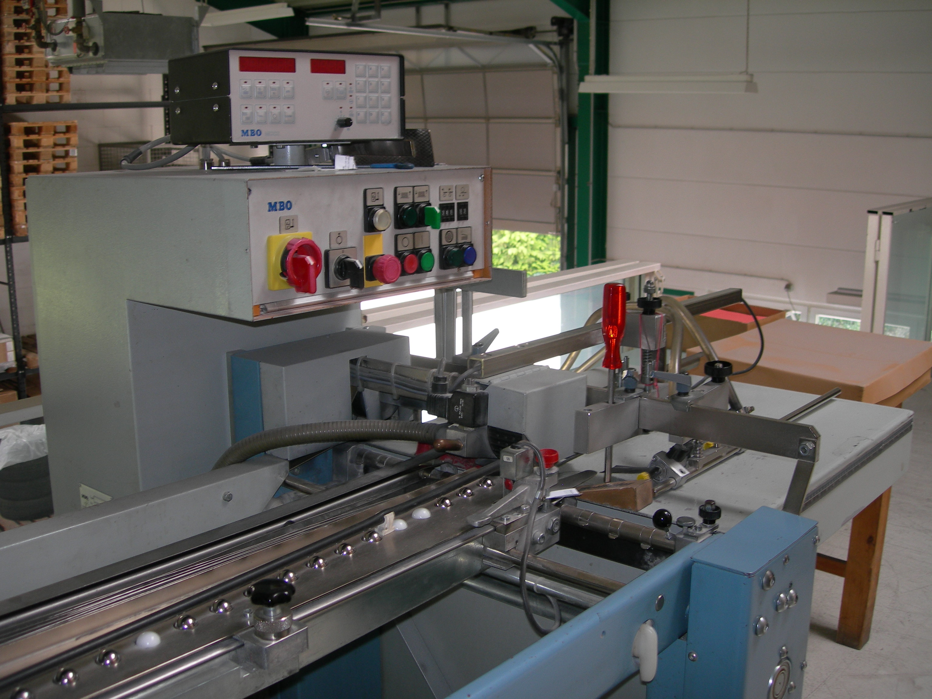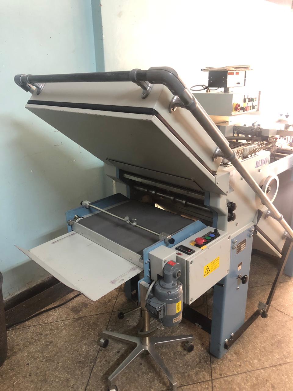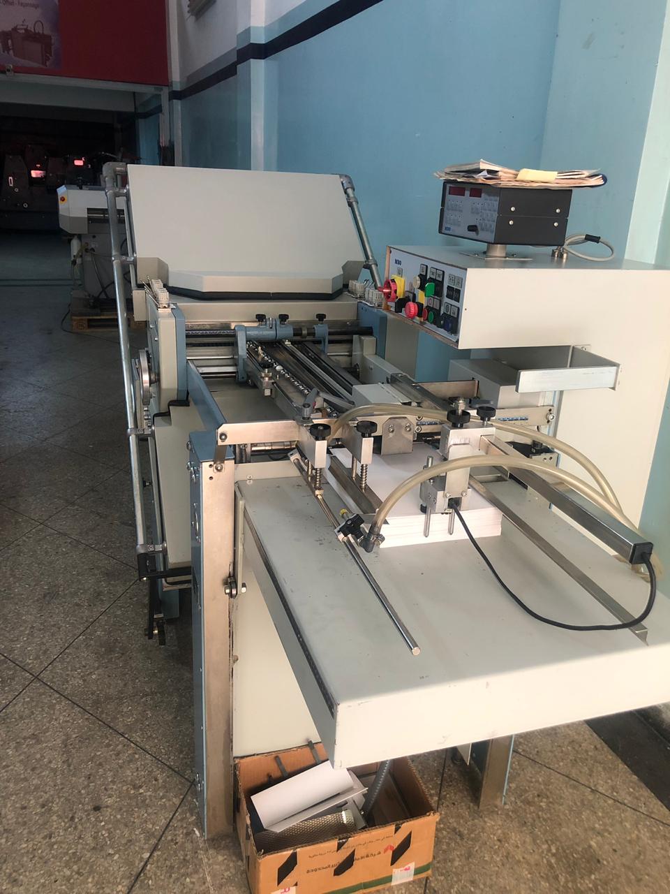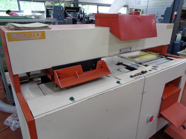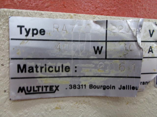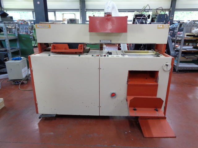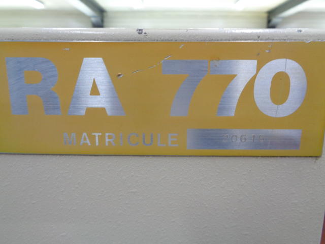 Appareil automatique à relier sans couture MULTITEX RA 770, 1pince mise en pression de la liasse par préserrage à pédale, cylindre de fraisage avec sac d'aspiration des poussières, ancollage Hot-Melt avec bac chauffé par bain d'huile (régulation de température pour huile et colle) et répartiteur chauffant ajustable en hauteur pour égaliser l'épaisseur du film de colle déposé sur le dos.emboîtage des couvertures sur des butées. collage et mise en forme par pressions dorsales et latérales avec temporisation du temps de serrage, bac de réception avec empilage et retour automatique du chariot, compteur de reliures sécurités : double commande pour le serrage des feuilles à relier, cartes sur les ensemble en mouvement, coup de poing d'arrêt d'urgence, automatisme électromécanique, jusqu'à 1 reliure toutes les 15 secondes avec un opérateur (production journalière maximum : environ 2000 brochures), préparation du dos et pose des couvertures avec bouton-poussoir lumineux reliure de 2 à 700 feuilles à 70 mm longueur d'encollage de quelques mm à 360 mm - largeur : environ 500 mm puissance requise : 4KW