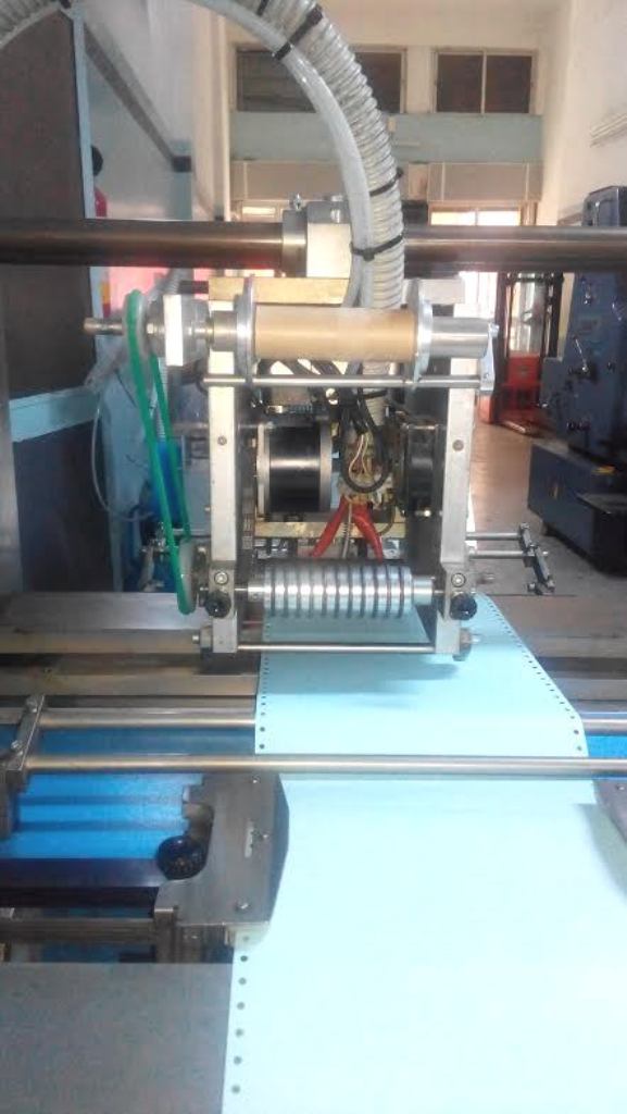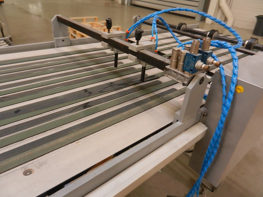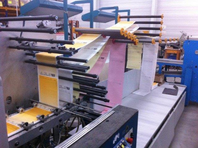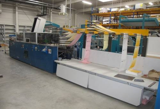 Marque : BAMA PACK COLLATOR ; Modèle : 3000 ; Laize : 50 cm ; Année: 2003 ; 6 postes d'assemblage ; 6 pistolets colle ; Unité Cobeflex ; Numérotation unité encrage par des rouleaux ; Coupe transversale rotative pour la production de la A4 ; Crimp-Lock ; Sortie pli ; Sortie coupe ; Vitesse Max : 170 m/min
