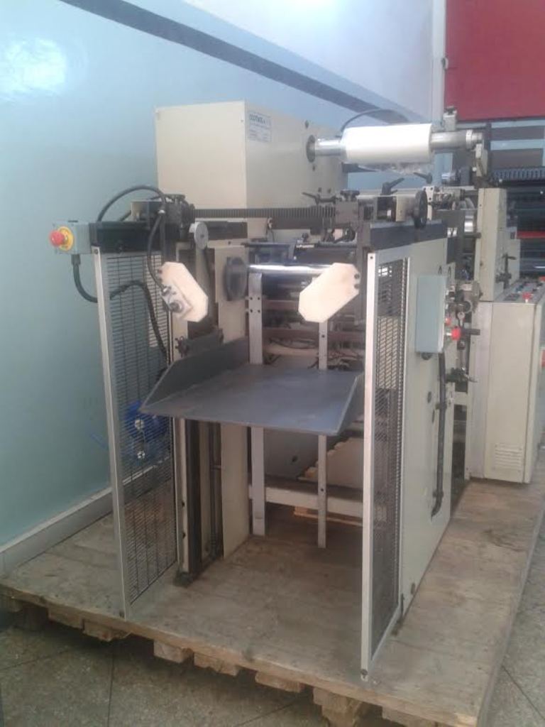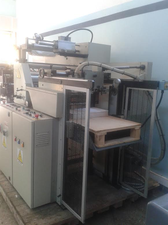 Format maximal : 520x750 mm ; Format minimum : 200x290 mm ; Vitesse mécanique maximale : 30 m / min ; Puissance maximale : poids : 135 gr / m2 Ã 450 gr / m2 ; Pression : pneumatique ; Entrainement de la tête : pneu ; hauteur de la pile : 530 mm ; Puissance installée : 8. 5 Kw ; Alimentation électrique : phase 400V 50Hz ; Année : 2006 ; Équipée avec margeur pile, chauffe cylindre par huile, séparateur des feuilles, sortie inclinée