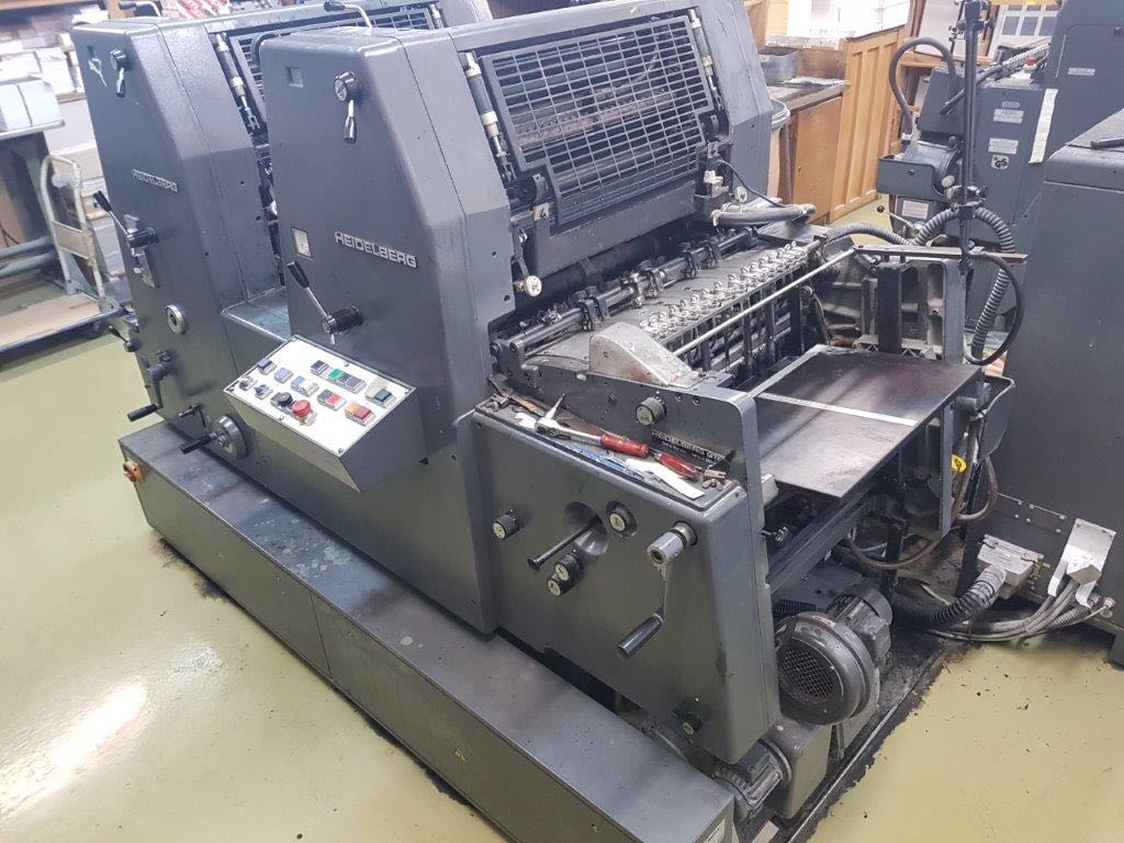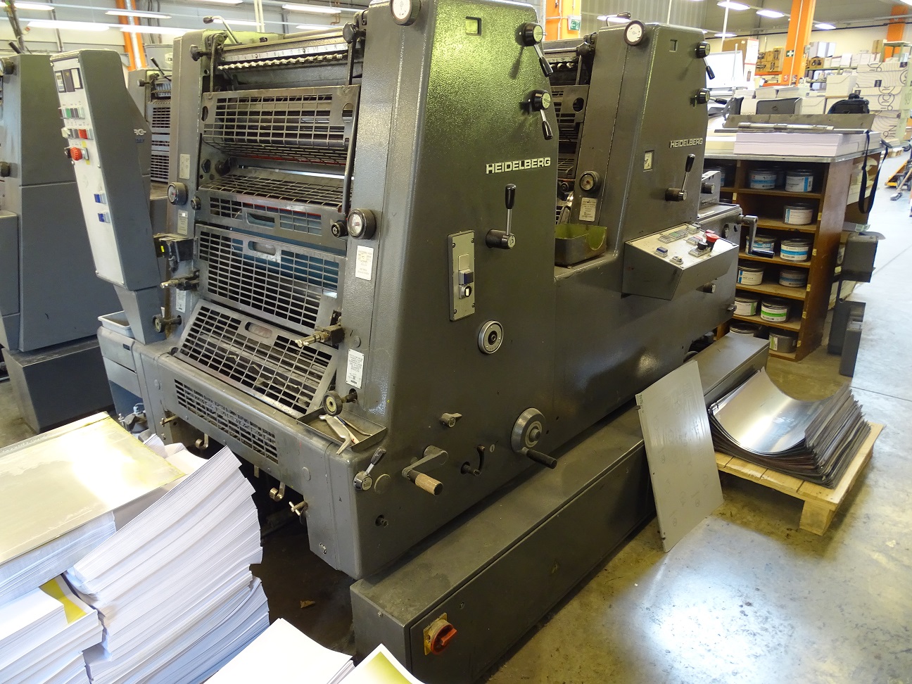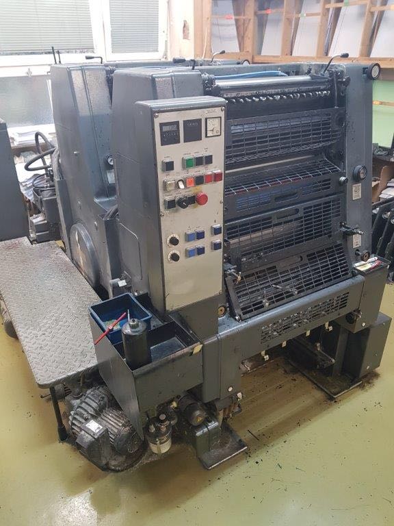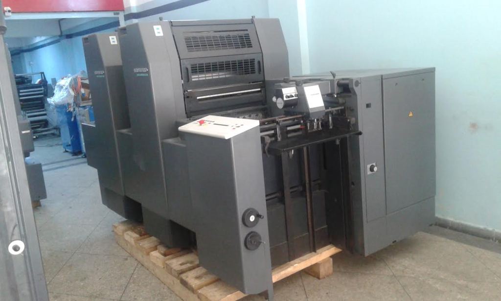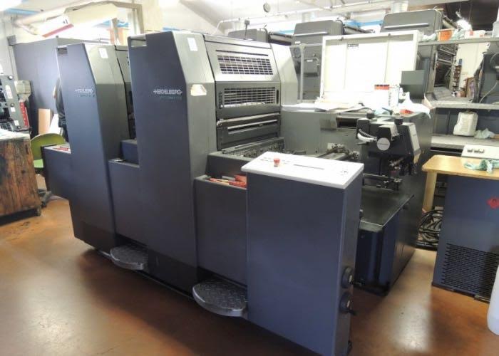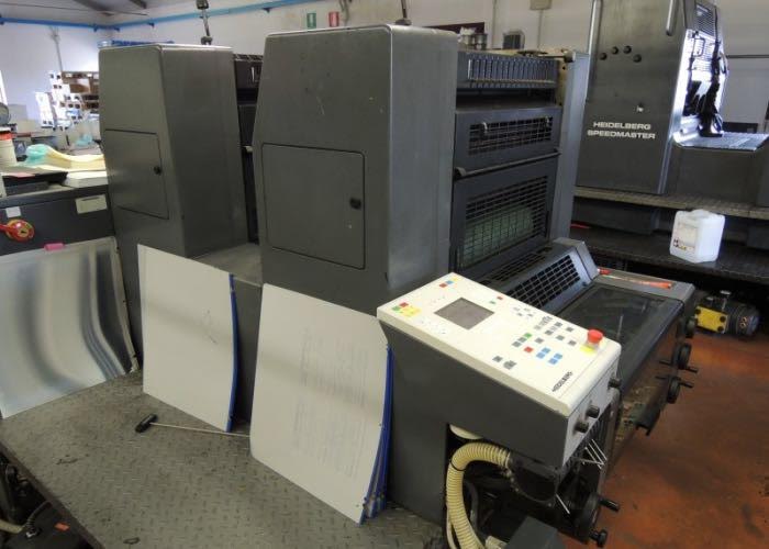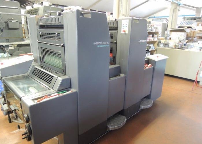 Marque : HEIDELBERG ; Type : SM 52 ; Couleur : Deux ; Format : 37*52 ; Calage automatique des plaques AUTOPLATE ; Mise au format automatique ; Pupitre CP TRONIC ; Mouillage ALCOLOR avec Refrigeration ; Tous lavages automatiques (blanchets, rouleaux, cylindre de marge) ; Antimaculateur ; Vitesse : 15.000 feuilles/heure ; Version Plus