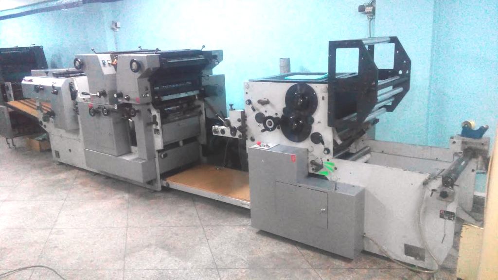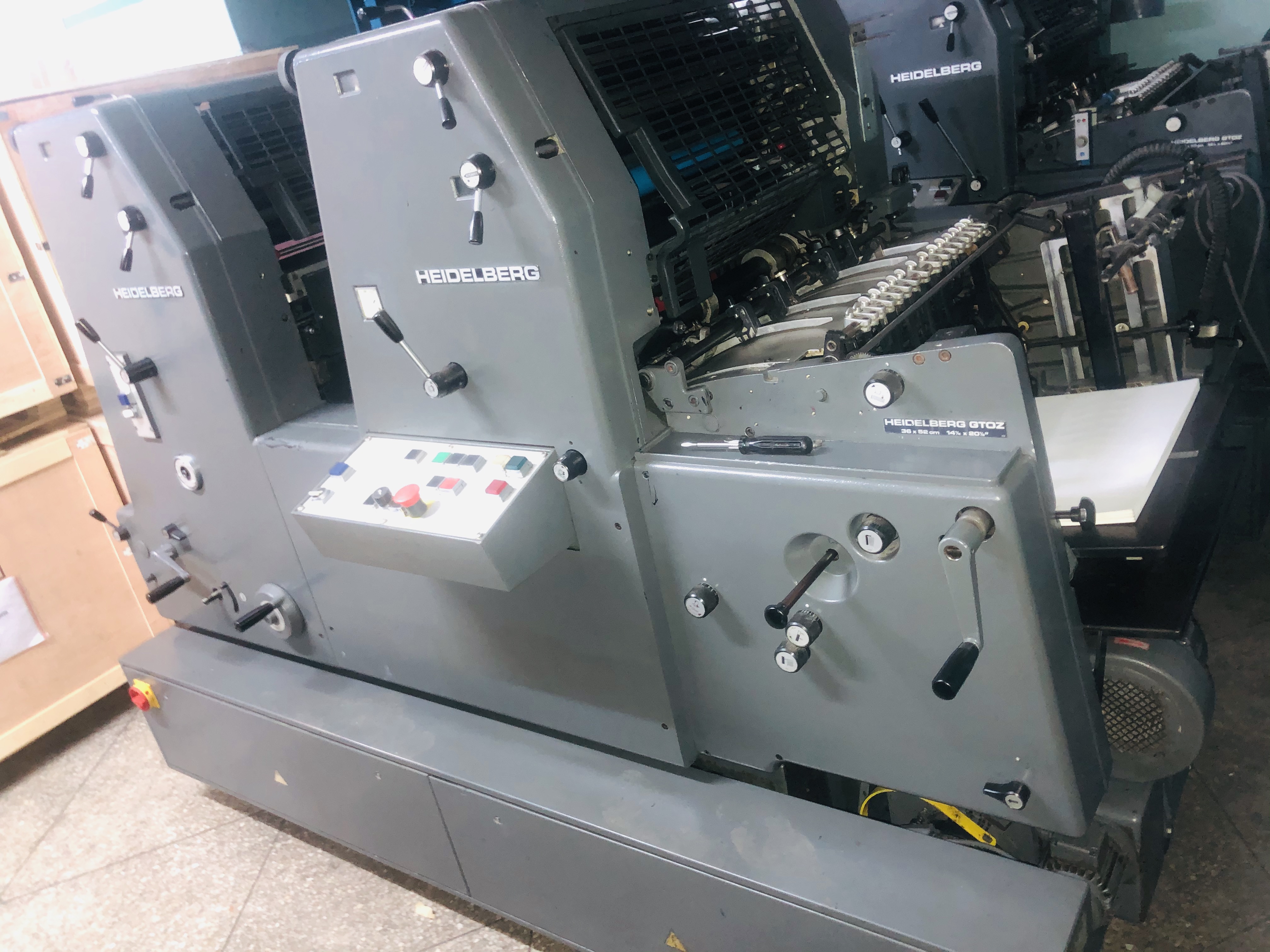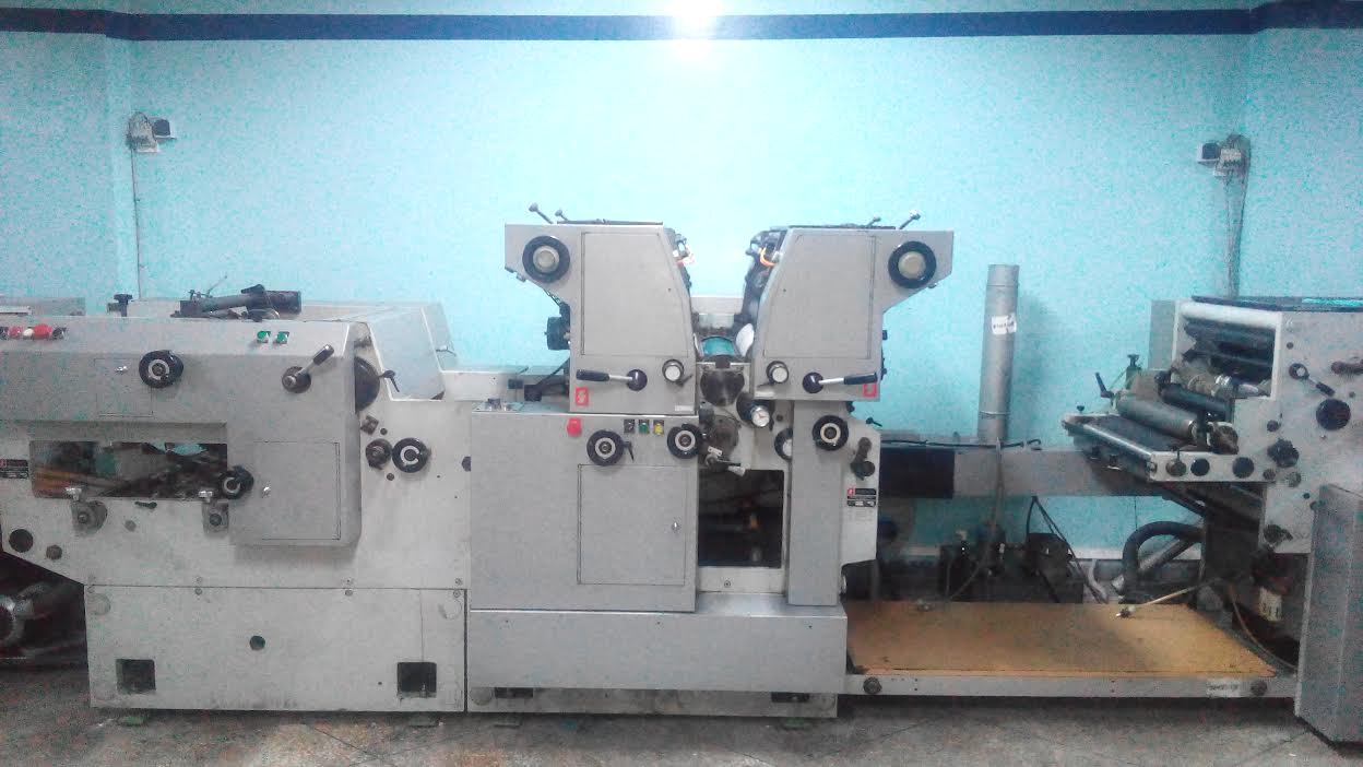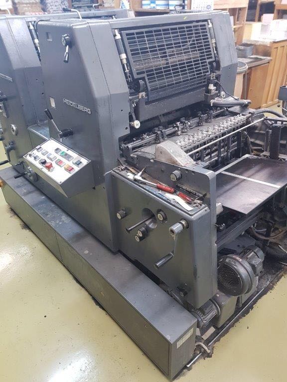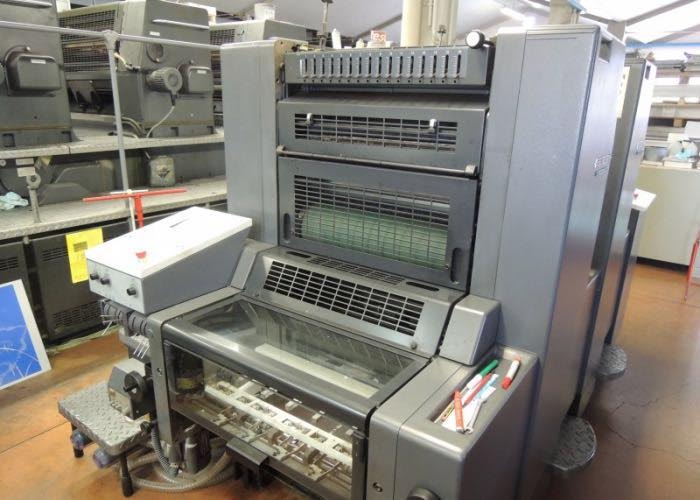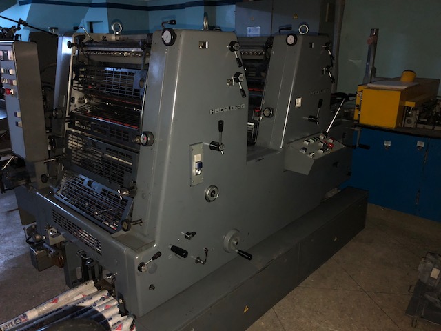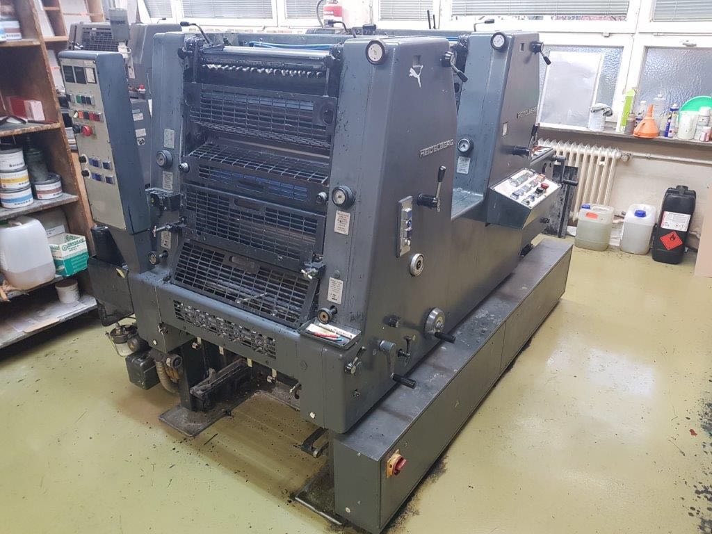 Marque : HEIDELBERG ; Type : SM 52 ; Couleur : Deux ; Format : 37*52 ; Calage automatique des plaques AUTOPLATE ; Mise au format automatique ; Pupitre CP TRONIC ; Mouillage ALCOLOR avec Refrigeration ; Tous lavages automatiques (blanchets, rouleaux, cylindre de marge) ; Antimaculateur ; Vitesse : 15.000 feuilles/heure ; Version Plus