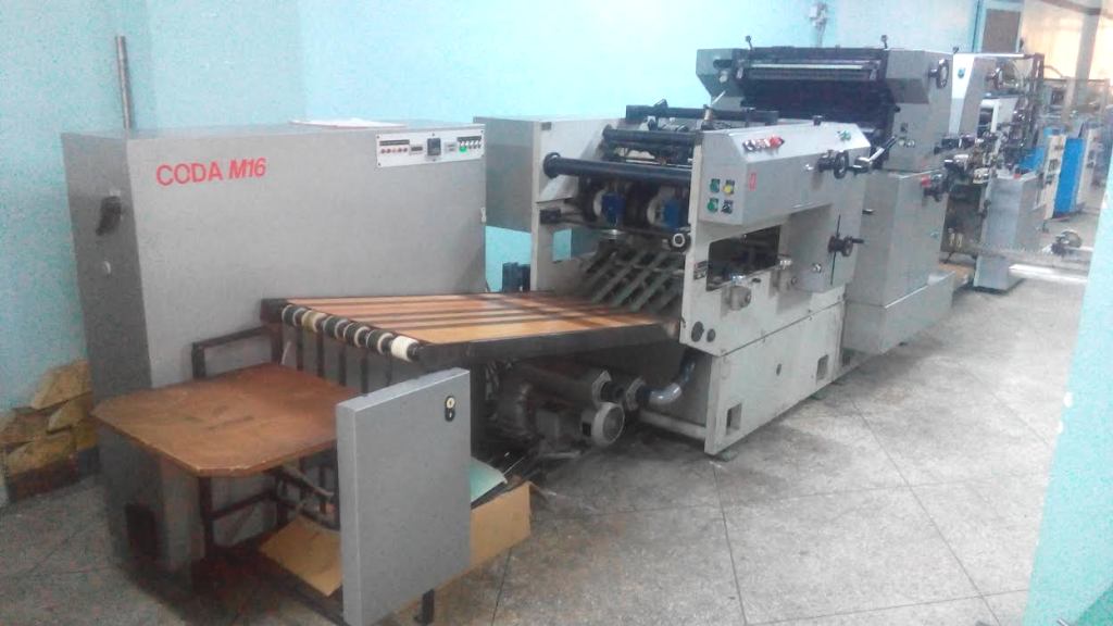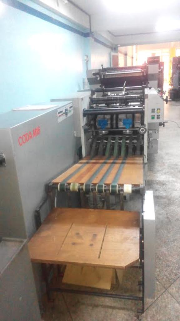 Marque : CODIMAG ; Type : CODA M16; Couleur : Deux ; Bobine-pli ou pack to pack ; Derouler 50 ; Double perforation Carroll "NG" ; Mouillage alcool baldwin ; Systeme twist pour le recto-verso ; 1 Cylindre magnetique 16 ; Plieuse